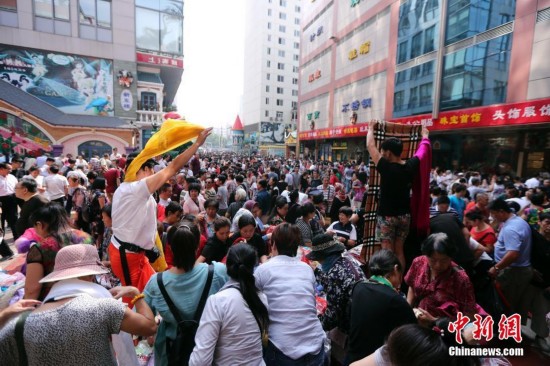 9月15日,商戶聚集在北京天意商城門口甩賣商品,吸引大批顧客搶購(gòu)。天意商城是北京規(guī)模最大的小商品批發(fā)兼零售市場(chǎng),為疏解北京非首都功能,天意商城將于9月16日關(guān)門停業(yè)。中新社記者 盛佳鵬 攝