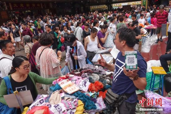 9月15日,天意商戶舉起二維碼方便顧客掃碼支付,以新式支付方式助力傳統(tǒng)零售。當(dāng)日,自1992年開業(yè)至今的北京天意市場(chǎng)迎來(lái)其在北京西城阜外大街營(yíng)業(yè)的最后一日,商家趁機(jī)“瘋狂甩貨”,大批北京民眾也紛至沓來(lái)。這里曾是北京著名的小商品商城,聚集了數(shù)千家商戶。為疏解北京非首都功能,天意商城將于本月16日關(guān)門停業(yè)。中新社記者 崔楠 攝