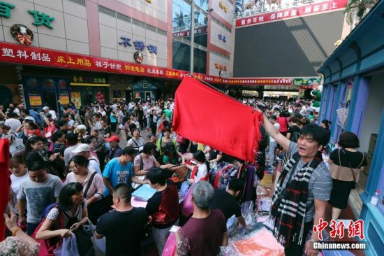 9月15日,商戶在北京天意商城甩賣商品,吸引大批顧客搶購(gòu)。天意商城是北京規(guī)模最大的小商品批發(fā)兼零售市場(chǎng),為疏解北京非首都功能,天意商城將于9月16日關(guān)門停業(yè)。中新社記者 盛佳鵬 攝