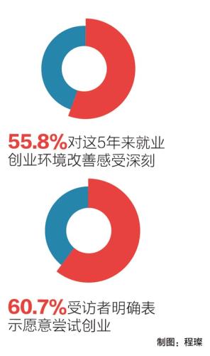56.7%的受訪者感覺這5年來創(chuàng)新創(chuàng)業(yè)的環(huán)境氛圍越來越好。60.7%的受訪者明確表示愿意嘗試創(chuàng)業(yè)。