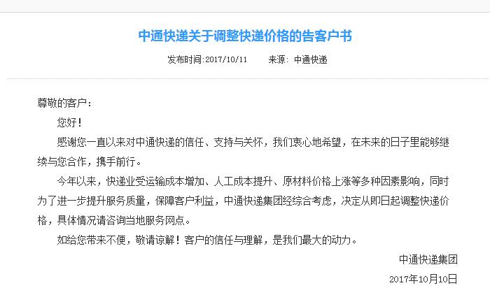 中通快遞官網(wǎng)稱將調(diào)整快遞價(jià)格