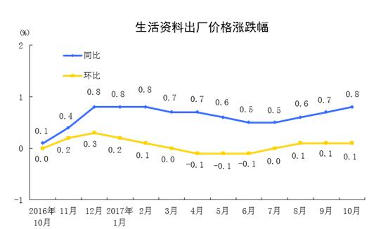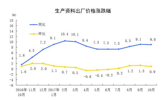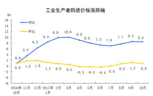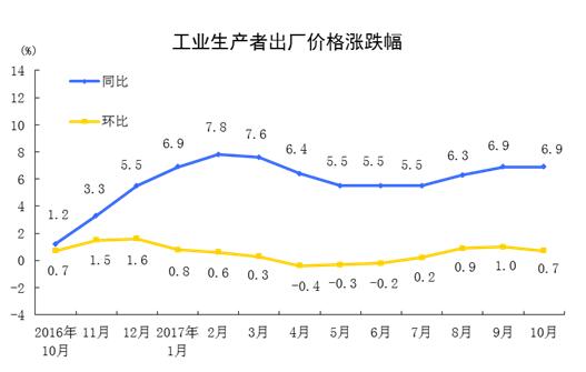 人民網(wǎng)北京11月9日電(李楠樺)國家統(tǒng)計局官方網(wǎng)站公布數(shù)據(jù)顯示,2017年10月份,全國工業(yè)生產(chǎn)者出廠價格同比上漲6.9%,環(huán)比上漲0.7%。工業(yè)生產(chǎn)者購進價格同比上漲8.4%,環(huán)比上漲0.9%。1-10月平均,工業(yè)生產(chǎn)者出廠價格同比上漲6.5%,工業(yè)生產(chǎn)者購進價格同比上漲8.4%。