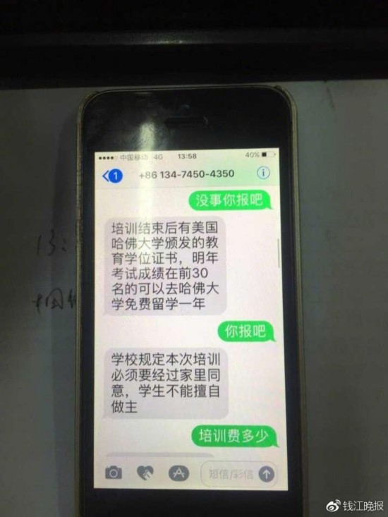 “爸,你快點幫我報個名吧!把錢直接打給我們學(xué)校李老師的賬號就行!彬_子把“老師”的姓名和電話還有銀行賬號發(fā)了過來。