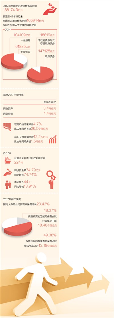 防風(fēng)險(xiǎn)大幕開(kāi)啟于2017年。這一年,監(jiān)管部門專項(xiàng)整治市場(chǎng)亂象,彌補(bǔ)制度短板,引導(dǎo)金融機(jī)構(gòu)回歸本源,專注主業(yè),增強(qiáng)服務(wù)實(shí)體經(jīng)濟(jì)能力。2018年金融防風(fēng)險(xiǎn)將在哪些重點(diǎn)領(lǐng)域出手?投資者和企業(yè)等市場(chǎng)主體如何看待防風(fēng)險(xiǎn)?怎樣建立防風(fēng)險(xiǎn)的長(zhǎng)效機(jī)制,從根源上遏制風(fēng)險(xiǎn)產(chǎn)生的苗頭?我們從銀行業(yè)、資本市場(chǎng)、保險(xiǎn)業(yè)和地方融資平臺(tái)四個(gè)領(lǐng)域,聚焦2017年防風(fēng)險(xiǎn)的主要成效,反映企業(yè)、投資者、金融機(jī)構(gòu)的實(shí)際感受和來(lái)年期盼,共同探討構(gòu)筑今年金融業(yè)防風(fēng)險(xiǎn)屏障的有效路徑。