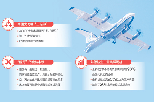 近日,AG600大型水陸兩棲飛機(jī)“鯤龍”首飛成功,黨中央、國(guó)務(wù)院發(fā)賀電表示熱烈的祝賀和親切的慰問(wèn)。AG600與運(yùn)—20大型運(yùn)輸機(jī)、C919大型噴氣式客機(jī)一起,被稱為中國(guó)大飛機(jī)“三兄弟”。