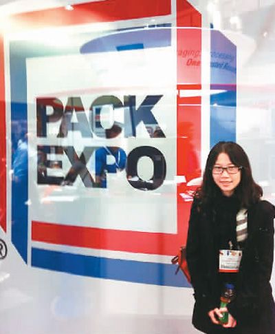 圖為李穎留學(xué)時(shí)參加美國最大的包裝展時(shí)的留影。