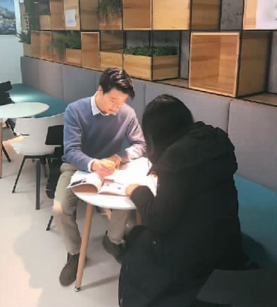 圖為陳戈(左)與同事探討關(guān)于留學生二手交易中存在問題的調(diào)研結(jié)果。