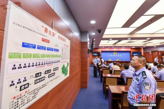 資料圖:廣東省公安廳內(nèi)展示的“賽比安”網(wǎng)絡傳銷組織架構(gòu)圖。中新社記者 陳驥旻 攝