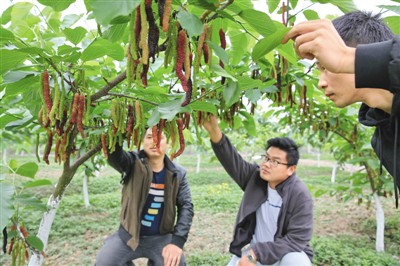 圖為農(nóng)業(yè)技術(shù)人員帶客戶查看即將進入采摘期的臺灣四季長果桑葚。XPV安康新聞網(wǎng)