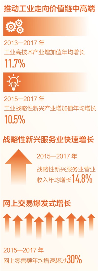 工業(yè)高技術產業(yè)、工業(yè)戰(zhàn)略性新興產業(yè)保持較快增長,推動工業(yè)向價值鏈中高端發(fā)展。2013—2017年,工業(yè)高技術產業(yè)增加值年均增長11.7%,高于全部工業(yè)年均增速5.1個百分點;2015—2017年,工業(yè)戰(zhàn)略性新興產業(yè)增加值年均增長10.5%,高于同期全部工業(yè)年均增速4.4個百分點。