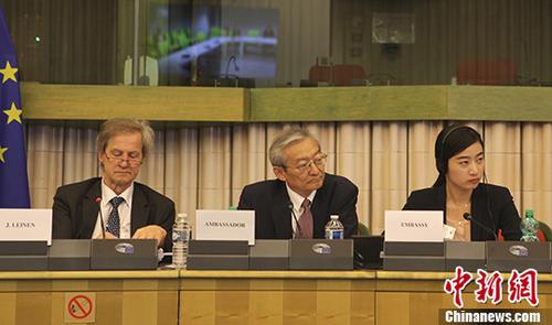 圖中為張明,左一為歐洲議會(huì)對(duì)華關(guān)系代表團(tuán)團(tuán)長(zhǎng)喬·萊恩。 中新社記者 德永健 攝
