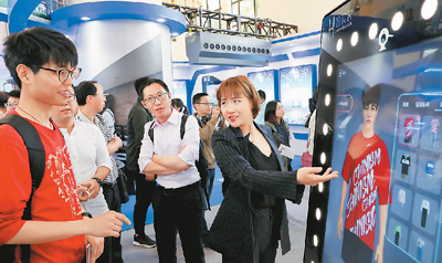 圖為工作人員(右一)指導(dǎo)參觀者使用一款互聯(lián)網(wǎng)智能試衣鏡。