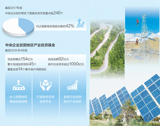 其中最有代表性的就是國資委牽頭、中央企業(yè)共同出資設(shè)立的中央企業(yè)貧困地區(qū)產(chǎn)業(yè)投資基金。經(jīng)過二期募資,所有中央企業(yè)都參與出資。截至今年4月底,規(guī)模達154億元,累計完成投資項目45個,自投金額92億元,吸引社會資本超過1000億元;鹜顿Y范圍覆蓋全部14個集中連片特困地區(qū),其中在“三區(qū)三州”已投資14.4億元,預(yù)計可帶動1.2萬貧困人口脫貧致富。