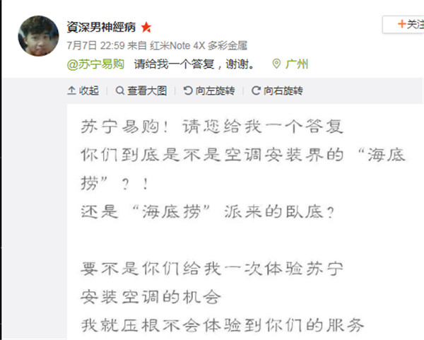 “蘇寧易購(gòu)!請(qǐng)您給我一個(gè)答復(fù),你們到底是不是空調(diào)安裝界的海底撈”。眾所周知,海底撈因其超乎想象的貼心服務(wù)在餐飲界一枝獨(dú)秀,廣州體驗(yàn)官蔡先生以海底撈作比,“怒贊”他的體驗(yàn)行程。