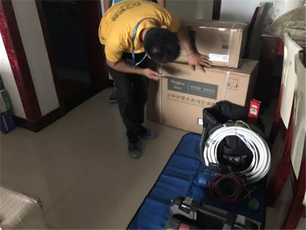 拆包裝前請(qǐng)業(yè)主核對(duì)發(fā)票以防貨不對(duì)版,拆包裝后再請(qǐng)業(yè)主確認(rèn)無(wú)磕碰損壞,驗(yàn)貨后方可進(jìn)入安裝環(huán)節(jié)。24樓無(wú)護(hù)欄的平臺(tái),外機(jī)安裝師傅綁好安全繩就出去,還要在不足2平米的小平臺(tái)上心無(wú)旁騖地作業(yè),“光看著就讓人驚心動(dòng)魄”。
