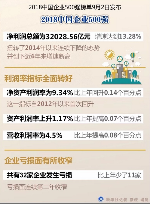 新華社西安9月2日電(記者許晟 張駿賀)2018中國企業(yè)500強(qiáng)榜單2日在西安發(fā)布,500強(qiáng)企業(yè)凈利潤總額為32028.56億元,增速達(dá)到13.28%,扭轉(zhuǎn)了2014年以來連續(xù)下降的態(tài)勢,并創(chuàng)下近6年來增速新高。