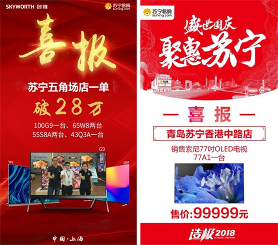 消費(fèi)升級趨勢下,越來越多的消費(fèi)者傾向于購買提升品質(zhì)生活的家電產(chǎn)品。而彩電作為客廳娛樂的重頭戲,表現(xiàn)尤其明顯。代表未來顯示技術(shù)的OLED電視,QLED量子點(diǎn)電視在這個(gè)國慶,都受到了消費(fèi)者的熱烈追捧。上海蘇寧五角廣場店開出了一筆超28萬元的彩電大單,客戶顧先生一口氣買下了188888元的創(chuàng)維百吋電視100G9、39999元的創(chuàng)維OLED電視65W8、11999元的創(chuàng)維OLED電視55S8A及創(chuàng)維43Q3A共計(jì)四臺電視。青島香港中路店則售出了售價(jià)99999元的索尼OLED電視77A1。