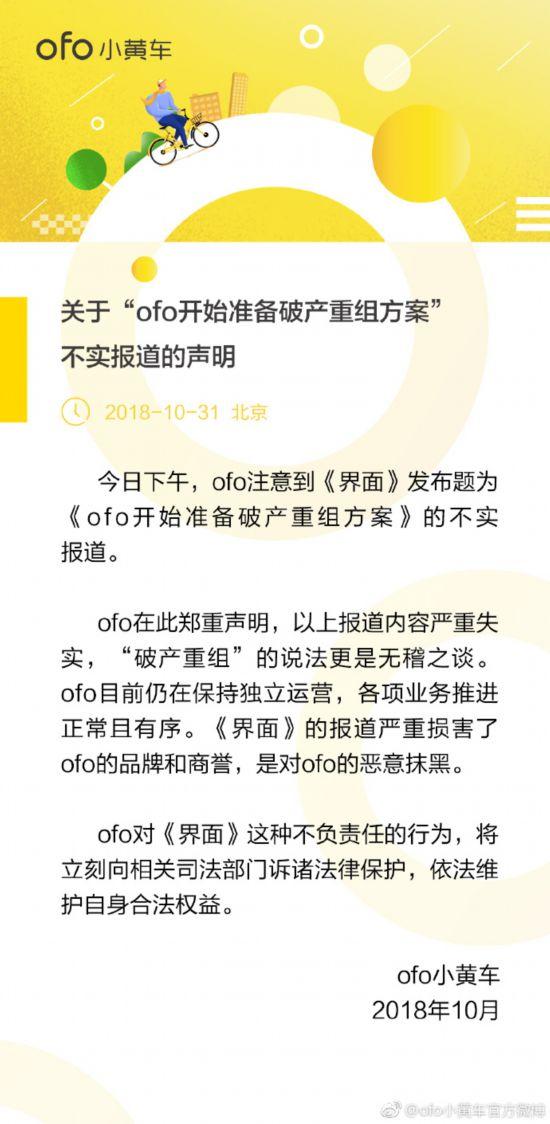 31日下午,ofo在官方微博發(fā)布一份聲明,稱此前媒體報道的“ofo開始準備破產(chǎn)重組方案”的說法是無稽之談,ofo將立刻訴諸法律保護,維護自身合法權(quán)益。