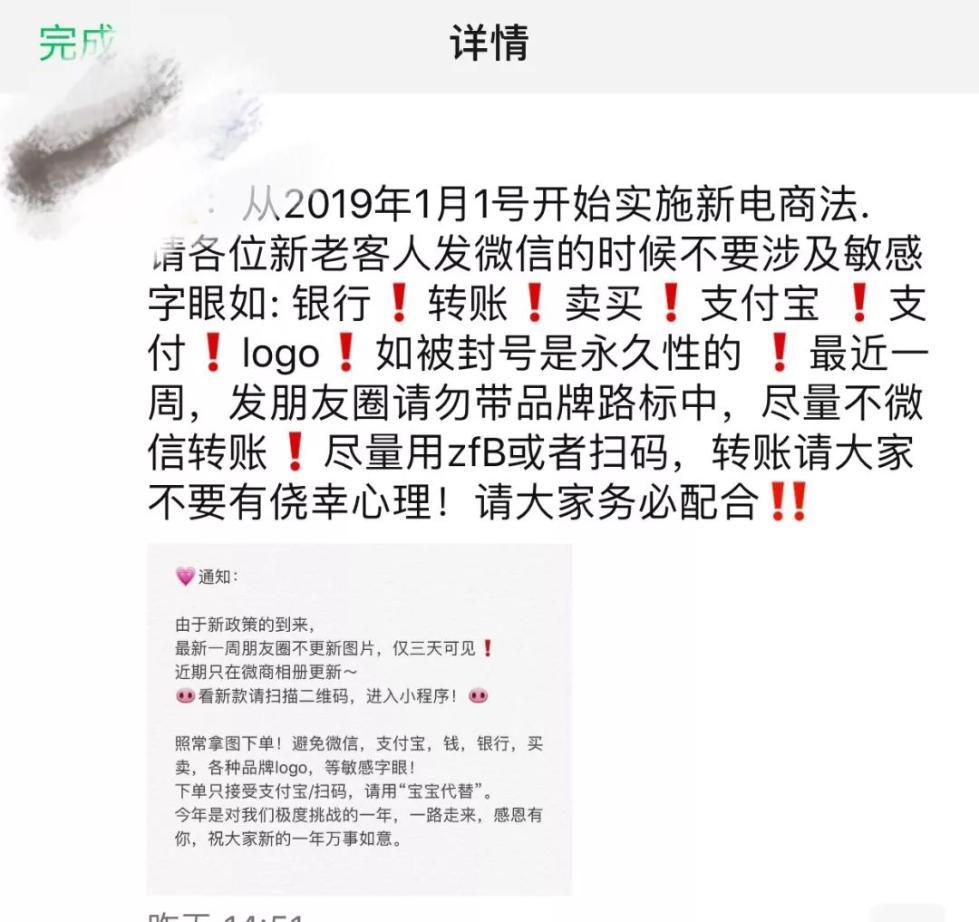 新《電商法》雖然沒有對(duì)微商、個(gè)人代購(gòu)的監(jiān)管沒有出具體細(xì)則,代購(gòu)圈內(nèi)卻已流傳了多個(gè)監(jiān)管措施版本,比如“敏感字眼交易雙方封號(hào)”、“不能微信直接付款”、“朋友圈限流和降權(quán)”等。
