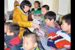 志愿者康雅靜在為貧困學(xué)生們發(fā)放書本。