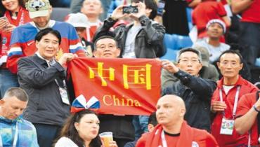 在圣彼得堡舉行的俄羅斯隊(duì)對(duì)陣埃及隊(duì)的世界杯小組賽中,中國球迷在看臺(tái)上打出條幅。