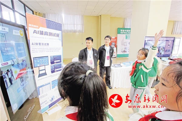 孩子們正在校園科技藝術(shù)展互動區(qū)游戲。