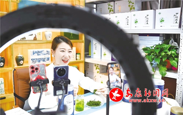 “平利漫山遍野都有絞股藍,絞股藍有‘東方神草’之稱,含有豐富的皂苷、黃酮、多糖類化合物,富有鋅、硒等多種微量元素,對人體有諸多好處。”11月5日,在第六屆中國進出口博覽會陜西館,平利縣富硒堂茶業(yè)有限公司負責人王秀梅向客商推薦介紹平利絞股藍。與此同時,在位于平利縣數(shù)字經(jīng)濟產(chǎn)業(yè)園里的公司直播間,員工成云正在進行著絞股藍產(chǎn)品的直播售賣。