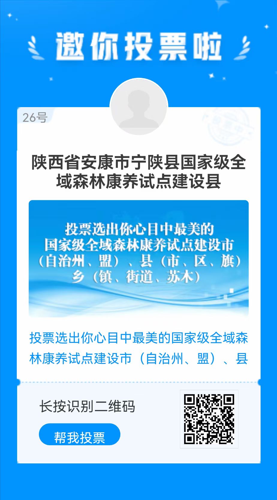 據(jù)了解,國(guó)家級(jí)森林康養(yǎng)試點(diǎn)建設(shè)單位認(rèn)定工作由中國(guó)林業(yè)產(chǎn)業(yè)聯(lián)合會(huì)負(fù)責(zé)開(kāi)展,經(jīng)自愿申報(bào)、主管部門(mén)審核推薦、合規(guī)用地和安全經(jīng)營(yíng)專(zhuān)項(xiàng)檢查、當(dāng)?shù)毓、?zhuān)家審查及認(rèn)定結(jié)果全國(guó)公示等程序,確定了2023年國(guó)家級(jí)森林康養(yǎng)試點(diǎn)建設(shè)單位名單。同時(shí)還開(kāi)設(shè)投票活動(dòng),選出大眾心目中最美的國(guó)家級(jí)森林康養(yǎng)試點(diǎn)建設(shè)基地和中國(guó)森林康養(yǎng)人家,請(qǐng)為森林履蓋率全國(guó)第一的“秦嶺之心 綠都寧陜”投上您寶貴的3票!(長(zhǎng)按二維碼即可投票,每個(gè)微信號(hào)每天可投3票)