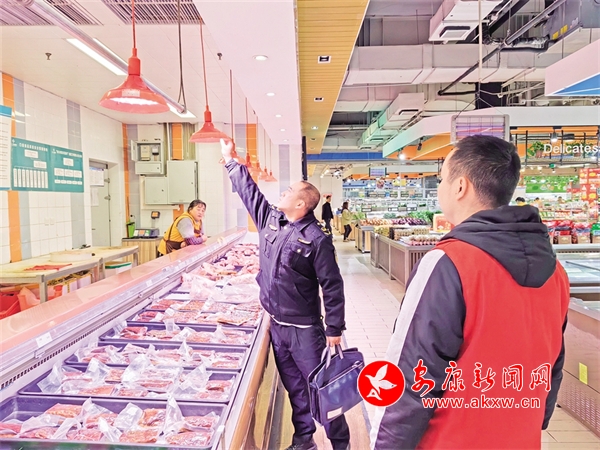 執(zhí)法人員在一家超市的生鮮肉售賣區(qū)檢查燈光照射情況。汪仁楊 攝