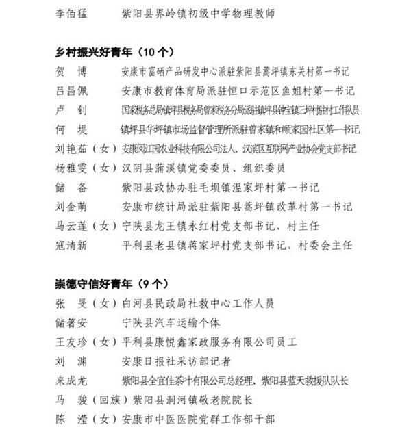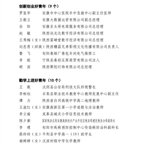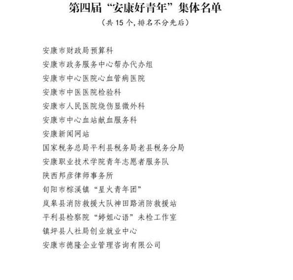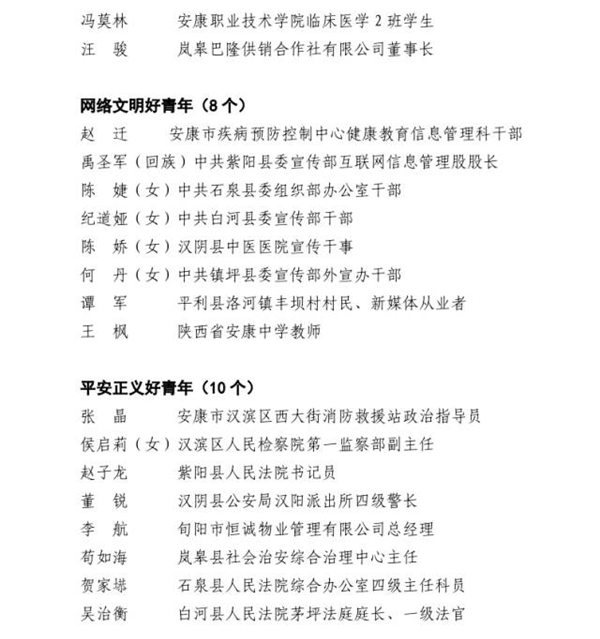 近日,由市委組織部、市委宣傳部、市委文明辦、市委政法委、市委網(wǎng)信辦、市教體局、市科技局、市民政局、市人社局、市鄉(xiāng)村振興局、市衛(wèi)健委、團(tuán)市委、市青聯(lián)共同開展的第四屆“‘中國夢·青年志’——尋找身邊的安康好青年”主題活動(dòng)結(jié)果揭曉。