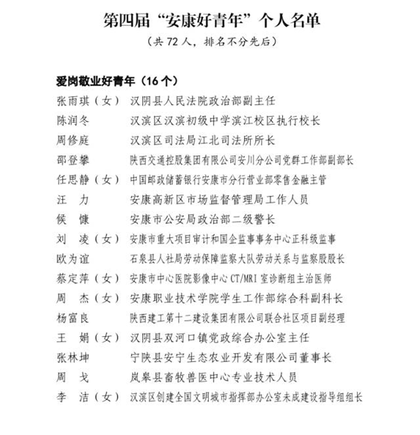 經(jīng)推報(bào)、初選、評審、復(fù)核、公示等環(huán)節(jié)現(xiàn)推選張雨琪等72人為第四屆“安康好青年”個(gè)人,安康市財(cái)政局預(yù)算科等15個(gè)集體為第四屆“安康好青年”集體。