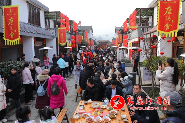 走進石泉縣中壩作坊小鎮(zhèn),大紅燈籠高高掛,山貨特產(chǎn)來云集,洋溢著喜慶的過年氛圍。隨著打連錢、舞彩獅、抬花轎、采蓮船等民俗展演活動開始,中壩文化休閑廣場上人山人海,熱鬧非凡。陜北民歌手、安康小場子、漢調二黃等非遺傳承“文化走親”活動,更是給廣大游客和城鄉(xiāng)群眾帶來豐富多彩的文化體驗。“上菜嘍——”隨著一聲長長的吆喝聲,最具年俗特色的庖湯宴開始了,方桌板凳擺長街,用剛剛宰殺的新鮮豬肉烹飪出的各色陜南傳統(tǒng)美食,吸引了眾多鄉(xiāng)親和游客來品嘗。