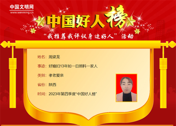 周姿龍,女,1969年8月生,陜西省安康市漢濱區(qū)晏壩鎮(zhèn)泰山廟村村民。丈夫車禍摔跤致癱在家后,周姿龍堅強地挑起了生活的重?fù)?dān)。13年來,她護(hù)理身體癱瘓的丈夫、照顧精神障礙的姑姐、照料年事已高的公公,用自己的堅定和責(zé)任,為家人撐起了一片愛的天空。