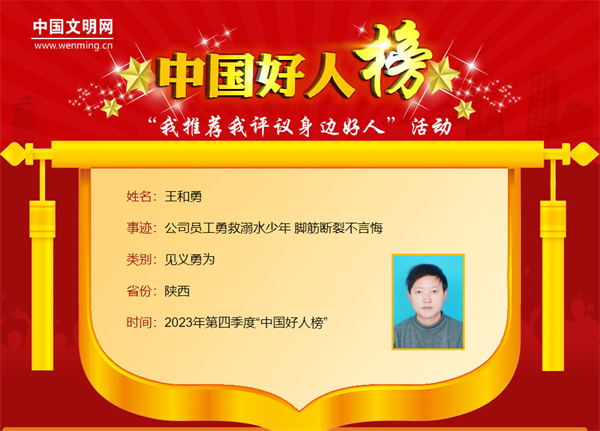 王和勇,男,1987年8月生,陜西省水務(wù)公司職工。在少年溺水的危機時刻,王和勇忘記自己“準(zhǔn)爸爸”的身份,毫不猶豫跳進(jìn)水流湍急的河里奮勇施救。王和勇曾獲“陜西好人”榮譽。