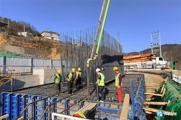 嵐河特大橋全長674.15m,樁基132根,方墩及空心墩10個,承臺12個,墩身高度大于40m的共有7處,其中最高墩高97m,最大跨度為112m,橫跨嵐河,是康渝高鐵全線重難點工程,由中鐵十四局集團承建。此次澆筑的3#墩承臺,長19.8m,寬9.5m,高4m,澆筑混凝土600余方,用時12.5個小時澆筑完成。