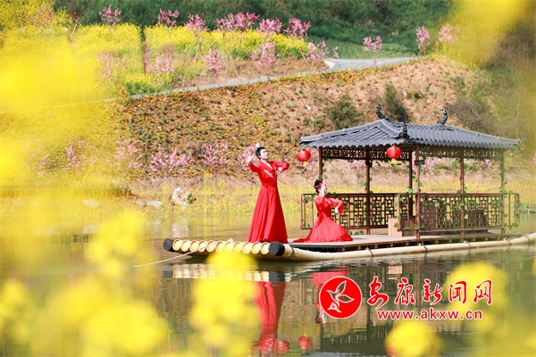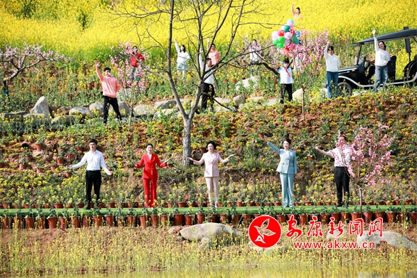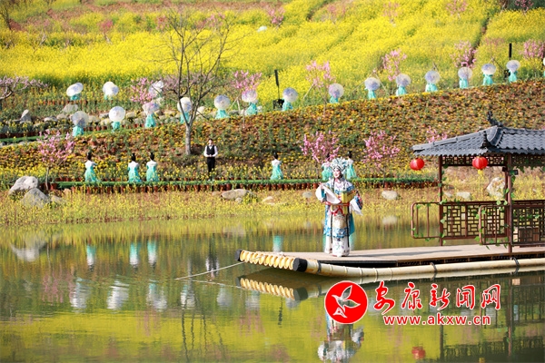 春日的水田溝村生機勃發(fā),漫山的油菜花在暖陽下爭相怒放,山坡下是一汪清澈的湖水。活動依山就勢、水陸并用,將演員、舞臺、道具與水田溝村地形地貌完美融合,營造出“人在畫中游,畫在景中走”的和美景象。隨著原創(chuàng)歌曲《水田溝的油菜花》悠揚動聽的歌聲從湖面的小船傳來,活動正式拉開帷幕,獨唱《問春》、情景詩朗誦《母親河》、歌伴舞《醉美桃花源》、情景劇《桃花源記》、漢劇歌舞《喬木花》、原創(chuàng)歌曲《阿依娜》、歌伴舞《幸福安康》等精彩節(jié)目相繼上演,悠揚的歌聲、曼妙的舞姿在湖上、在油菜花田、在蜿蜒的山路漸次呈現(xiàn),將現(xiàn)場觀眾和游客迅速帶入安康桃花源美麗夢幻的油菜花海世界,沉浸式感受安康高新區(qū)產(chǎn)城綠融合發(fā)展和鄉(xiāng)村振興的顯著成效。