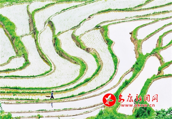 層層疊疊的梯田里,散落著田間的房舍、裊裊的炊煙、勞作的人群,好似一幅濃濃的山水田園詩(shī)畫(huà)。