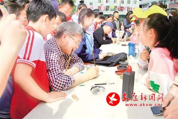 4月20日,白河縣城關(guān)小學(xué)舉辦讀書節(jié)活動,縣文聯(lián)書法家為孩子們書寫書簽。陳華 攝