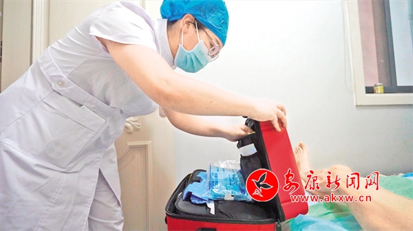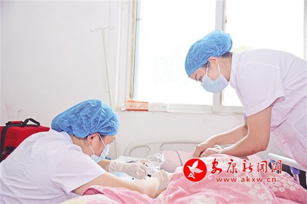 十幾分鐘后,白河縣人民醫(yī)院PICC?谱o(hù)士袁茜和杜曉雨帶著醫(yī)藥箱趕到城關(guān)鎮(zhèn)廣興金座8號樓3層樊阿姨家里。