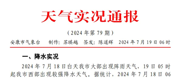 2024年7月19日10時18分接到省應(yīng)急廳第192號《暴雨橙色預(yù)警》:預(yù)計未來3小時我市漢濱區(qū)、寧陜縣降雨量將達(dá)50 毫米以上,未來6小時我市漢陰縣、石泉縣、旬陽市、白河縣將達(dá)50毫米以上,以上地區(qū)境內(nèi)發(fā)生山洪、泥石流等災(zāi)害風(fēng)險較高。