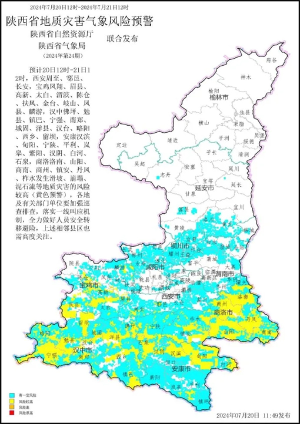 陜西省自然資源廳與省氣象局聯(lián)合發(fā)布地質(zhì)災(zāi)害氣象風(fēng)險黃色預(yù)警,預(yù)計7月20日12時至7月21日12時,下圖所示縣(區(qū))可能發(fā)生地質(zhì)災(zāi)害:其中我市漢濱、旬陽、寧陜、平利、嵐皋、紫陽、漢陰、白河、石泉發(fā)生滑坡、崩塌、泥石流等地質(zhì)災(zāi)害的風(fēng)險較高(黃色預(yù)警),各地及有關(guān)部門單位要加強(qiáng)巡查排查,落實一線叫應(yīng)機(jī)制,全力做好人員安全轉(zhuǎn)移避險,上述相鄰縣區(qū)也需高度關(guān)注。