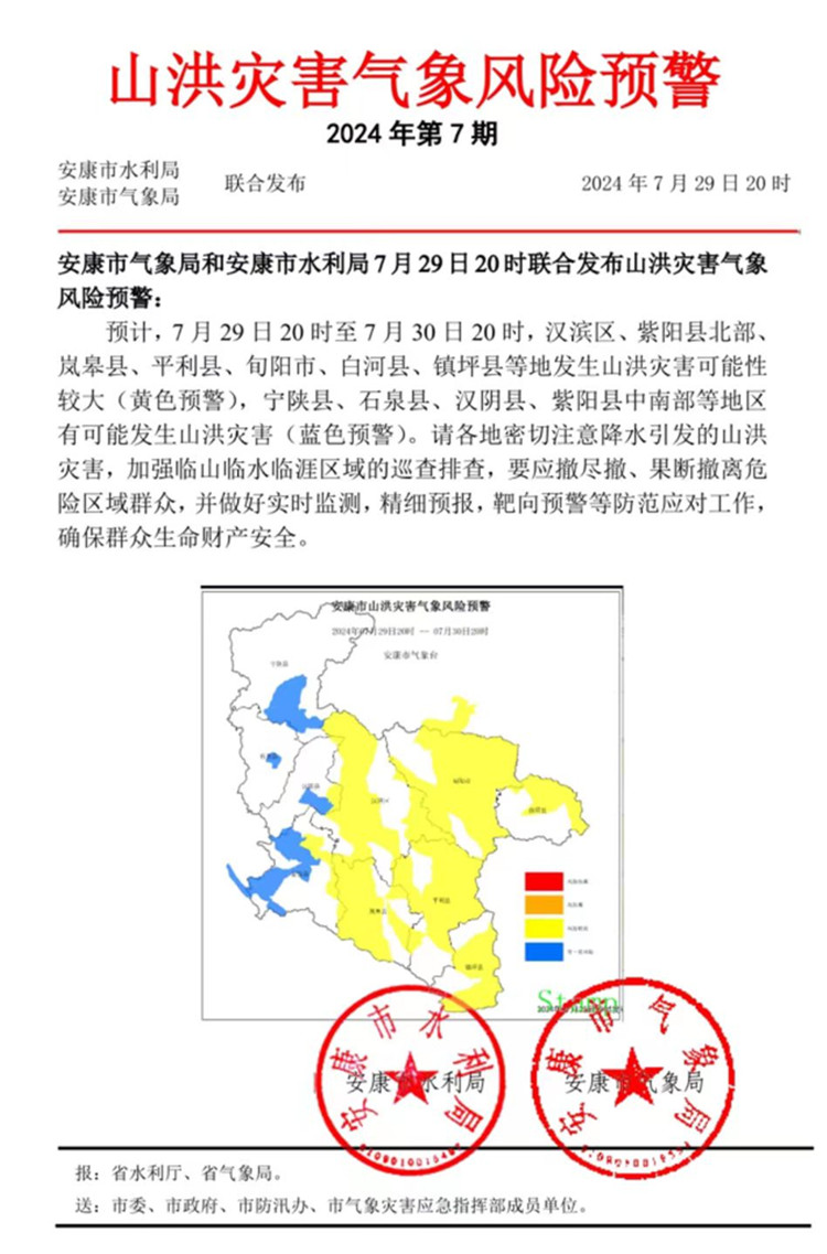 安康市氣象局和安康市水利局7月29日20時聯(lián)合發(fā)布山洪災(zāi)害氣象風(fēng)險預(yù)警:預(yù)計7月29日20時至7月30日20時,漢濱區(qū)、紫陽縣北部嵐泉縣、平利縣、旬陽市、白河縣、鎮(zhèn)坪縣等地發(fā)生山洪災(zāi)害可能性較大(黃色預(yù)警),寧陜縣、石泉縣、漢陰縣、紫陽縣中南部等地區(qū)有可能發(fā)生山洪災(zāi)害(藍色預(yù)警)。