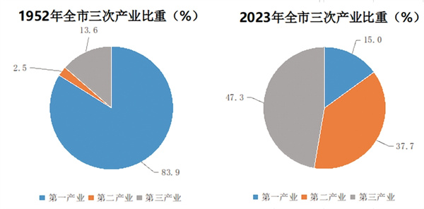 產(chǎn)業(yè)結(jié)構(gòu)日趨優(yōu)化。1952年,全市三次產(chǎn)業(yè)比為83.9︰2.5︰13.6,產(chǎn)業(yè)結(jié)構(gòu)呈“一、三、二”模式,為典型的農(nóng)業(yè)市,隨著工業(yè)經(jīng)濟(jì)和第三產(chǎn)業(yè)的不斷發(fā)展,全市第一產(chǎn)業(yè)比重逐年下降,二、三產(chǎn)業(yè)比重逐年上升,2012年三次產(chǎn)業(yè)比為19.4︰42.7︰37.9,第一產(chǎn)業(yè)占比首次低于20.0%,第二產(chǎn)業(yè)突破40.0%,產(chǎn)業(yè)結(jié)構(gòu)呈“二、三、一”模式;隨著第三產(chǎn)業(yè)不斷壯大,2020年占比45.3%,躍居三產(chǎn)之首,呈“三、二、一”模式,并連續(xù)保持4年,2023年全市三次產(chǎn)業(yè)之比15.0︰37.7︰47.3,以服務(wù)業(yè)為主的產(chǎn)業(yè)結(jié)構(gòu)加速形成。