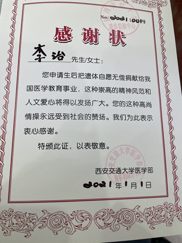15年來,李治還積極資助困難學(xué)生、為災(zāi)區(qū)捐資捐物,為他人、為社會(huì)付出了很多,但他總覺得不夠。2021年,他自愿申請(qǐng)并成功登記為遺體捐獻(xiàn)志愿者。“這是我那年送給自己的新年禮物。”他指著西安交通大學(xué)醫(yī)學(xué)部的感謝狀說。RKM安康新聞網(wǎng)