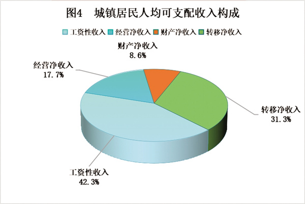 全市城鎮(zhèn)居民人均可支配收入35313元,比上年增加1674元,增長5.0%。其中,工資性收入14954元,增長5.5%,占可支配收入的比重為42.3%;經(jīng)營凈收入6264元,增長4.5%,占比17.7%;財產(chǎn)凈收入3028元,增長4.1%,占比8.6%;轉(zhuǎn)移凈收入11067元,增長4.9%,占比31.3%。