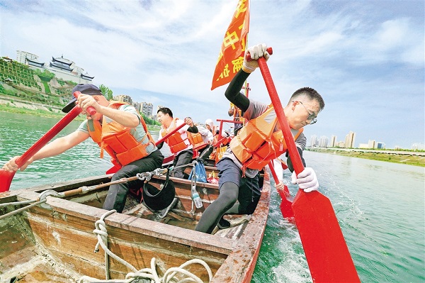 “中國紅 紅西鳳”杯第二十五屆安康漢江龍舟節(jié)主題活動(dòng),將于5月31日在龍舟文化園舉行。主題活動(dòng)結(jié)束后,30支龍舟代表隊(duì)將在漢江一橋至西津漢江大橋江面開展龍舟競(jìng)賽活動(dòng)。競(jìng)賽活動(dòng)包括800米折返追逐賽、400米直道競(jìng)速賽和800米直道競(jìng)速賽,市民可在龍舟文化園和一江兩岸觀賽。圖為5月24日正在進(jìn)行水上訓(xùn)練的安康衛(wèi)健·中醫(yī)醫(yī)院龍舟隊(duì)。(記者 潘潤(rùn)生 攝)