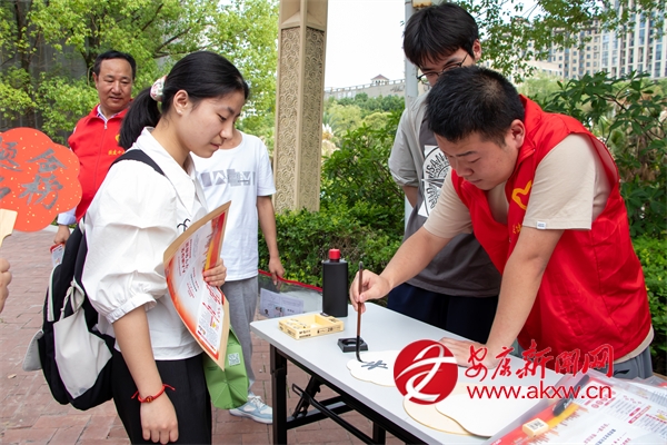 “翰墨飄香,助力高考”書法創(chuàng)作活動中,書法愛好者揮毫?xí),將靈動筆墨化作滿滿的祝福,為考生加油鼓勁。