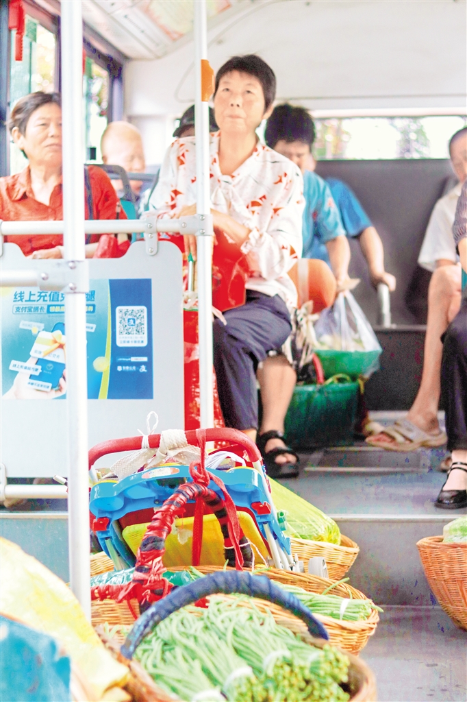 記者在途中看到,狹小的車廂內,滿是帶著露珠的新鮮蔬菜,還有公交駕駛員不厭其煩的服務態(tài)度。菜農緊挨著自己的竹筐坐在車內,迎著漫天霞光,將大包小包的蔬菜送向城市餐桌,這是他們的日常,唯一不同的是有了接他們進城的“專車”。