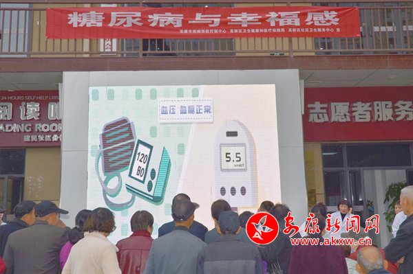 活動(dòng)圍繞“糖尿病與幸福感”主題,通過(guò)懸掛橫幅、免費(fèi)測(cè)血壓和血糖、循環(huán)播放糖尿病防治視頻、發(fā)放宣傳資料和支持性工具,市疾控中心工作人員向社區(qū)居民介紹了糖尿病的常見(jiàn)癥狀,日常生活中怎么預(yù)防糖尿病,糖尿病治療的“五駕馬車(chē)”,即健康教育、合理飲食、適量運(yùn)動(dòng)、規(guī)律用藥、自我監(jiān)測(cè)。共計(jì)發(fā)放各類(lèi)宣傳品1500余份,測(cè)血壓血糖100人。