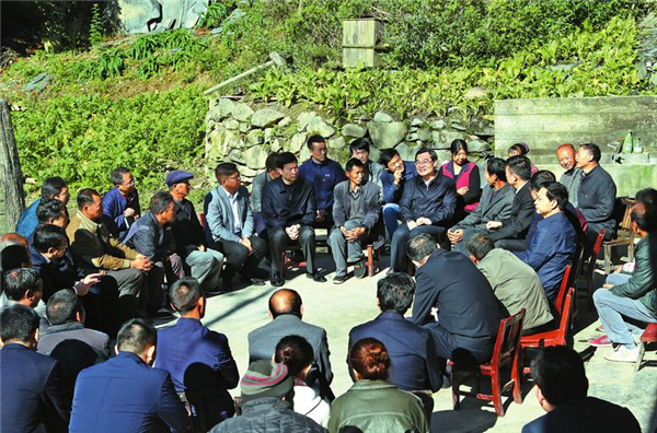 (10月10日,省委書記胡和平深入嵐皋縣南宮山鎮(zhèn)西河村,與部分群眾及鎮(zhèn)村干部進(jìn)行座談,了解扶貧工作進(jìn)展,聽取群眾意見建議,與大家一起商討脫貧致富的措施。陜西日報記者 宋紅梅/攝)